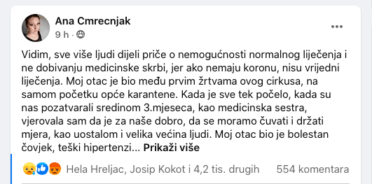 Vidim, sve više ljudi dijeli priče o nemogućnosti normalnog liječenja i ne dobivanju medicinske skrbi, jer ako nemaju koronu, nisu vrijedni liječenja.