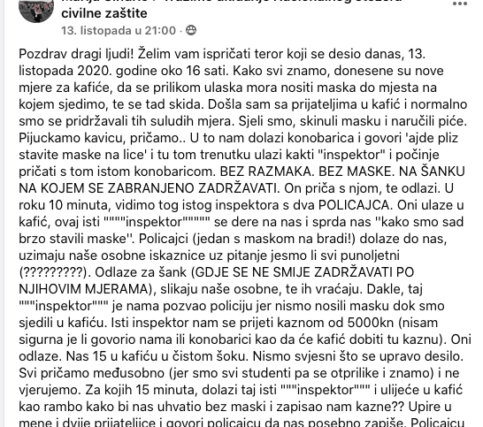 Pozdrav dragi ljudi! Želim vam ispričati teror koji se desio danas, 13. listopada 2020. godine oko 16 sati. Kako svi znamo, donesene su nove mjere za kafiće, da se prilikom ulaska mora nositi maska do mjesta na kojem sjedimo, te se tad skida. Došla sam sa prijateljima u kafić i normalno smo se pridržavali tih suludih mjera. Sjeli smo, skinuli masku i naručili piće. Pijuckamo kavicu, pričamo.. U to nam dolazi konobarica i govori ‘ajde pliz stavite maske na lice’ i tu tom trenutku ulazi kakti “inspektor” i počinje pričati s tom istom konobaricom. BEZ RAZMAKA. BEZ MASKE. NA ŠANKU NA KOJEM SE ZABRANJENO ZADRŽAVATI. On priča s njom, te odlazi. U roku 10 minuta, vidimo tog istog inspektora s dva POLICAJCA. Oni ulaze u kafić, ovaj isti “”””inspektor””””” se dere na nas i sprda nas ”kako smo sad brzo stavili maske”. Policajci (jedan s maskom na bradi!) dolaze do nas, uzimaju naše osobne iskaznice uz pitanje jesmo li svi punoljetni (?????????). Odlaze za šank (GDJE SE NE SMIJE ZADRŽAVATI PO NJIHOVIM MJERAMA), slikaju naše osobne, te ih vraćaju. Dakle, taj “””inspektor””” je nama pozvao policiju jer nismo nosili masku dok smo sjedili u kafiću. Isti inspektor nam se prijeti kaznom od 5000kn (nisam sigurna je li govorio nama ili konobarici kao da će kafić dobiti tu kaznu). Oni odlaze. Nas 15 u kafiću u čistom šoku. Nismo svjesni što se upravo desilo. Svi pričamo međusobno (jer smo svi studenti pa se otprilike i znamo) i ne vjerujemo. Za kojih 15 minuta, dolazi taj isti “””inspektor””” i ulijeće u kafić kao rambo kako bi nas uhvatio bez maski i zapisao nam kazne?? Upire u mene i dvije prijateljice i govori policajcu da nas posebno zapiše. Policajcu je već vidno dosta tog “””inspektora””” i govori mu kako su već uzeli naše podatke. Mi ga pitamo na temelju čega ćemo dobiti kazne, a on se dere na nas da to nije naša stvar. Oni odlaze po drugi put. Mi u još većem šoku.
