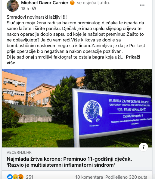 Razvio je multisistemni inflamatorni sindrom i, nažalost, preminuo. Imali smo više takvih slučajeva, o tom sindromu govorim zadnjih nekoliko mjeseci, no do sada su se, srećom, svi oni oporavili. Ovo je prvi slučaj smrti – kazao nam je prof. Goran Tešović, pročelnik Zavoda za infektivne bolesti Klinike Fran Mihaljević u Zagrebu.