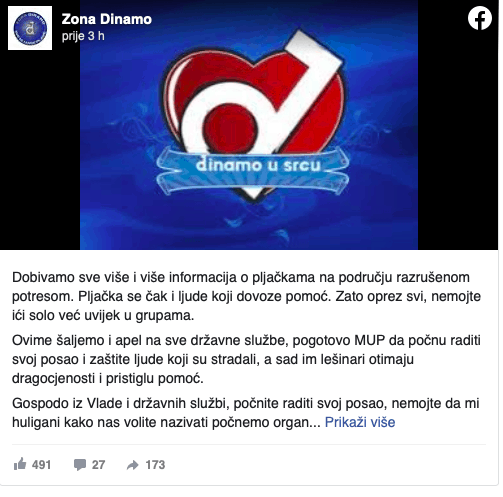 Ovime šaljemo i apel na sve državne službe, pogotovo MUP da počnu raditi svoj posao i zaštite ljude koji su stradali, a sad im lešinari otimaju dragocjenosti i pristiglu pomoć.